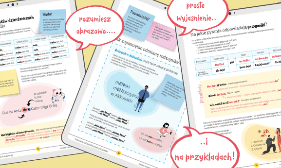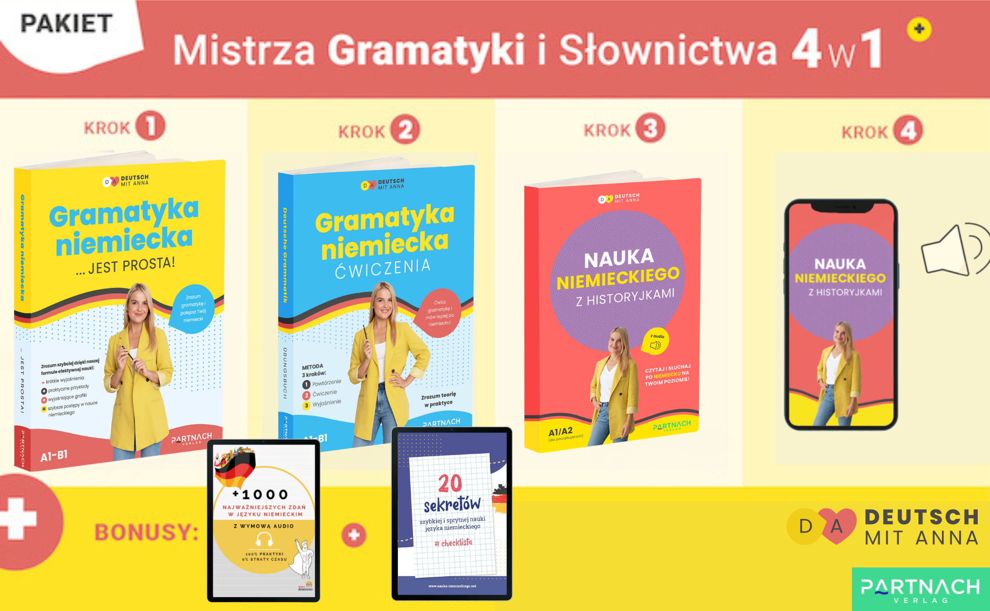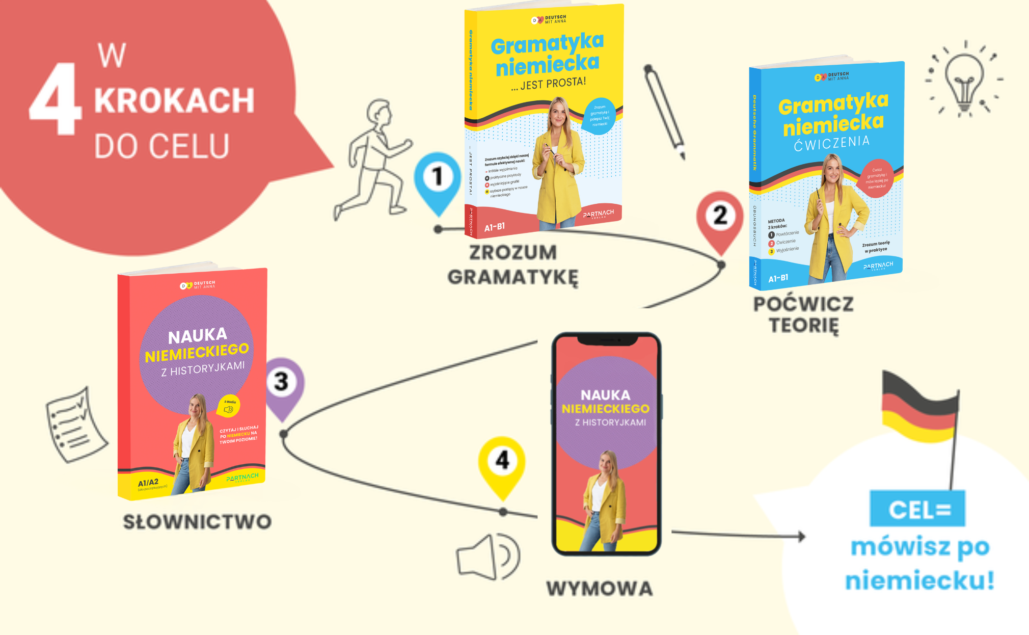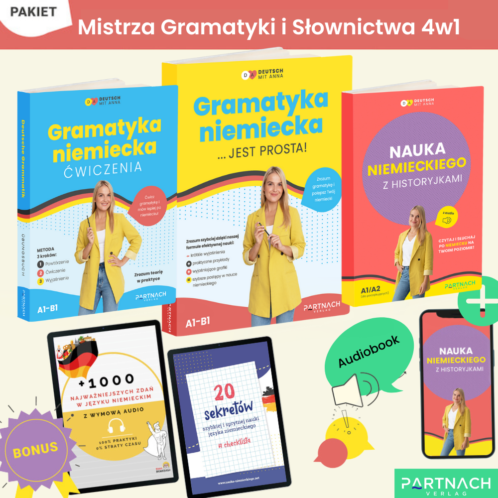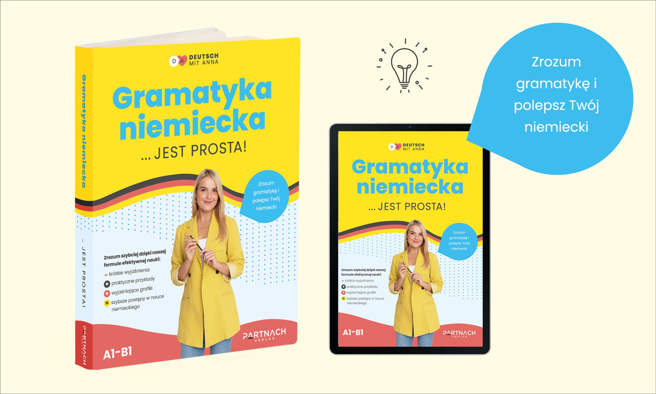 W podręczniku "Gramatyka niemiecka prosto wyjaśniona" wyjaśniam zasady gramatyki z poziomu A1-B1 w autorski, super-prosty, kolorowy sposób na 163 stronach w 43, lekcjach na 800 przykładach i 50 pomocnych ilustracjach.