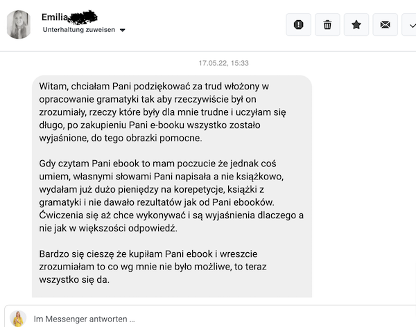 Jeśli jednak z jakiegoś powodu stwierdzisz, że mateirały nie są dla Ciebie, możesz je zwrócić. Napisz do mnie krótkiego maila na anna@nauka-niemieckiego.net, a ja zwrócę Ci pieniądze.